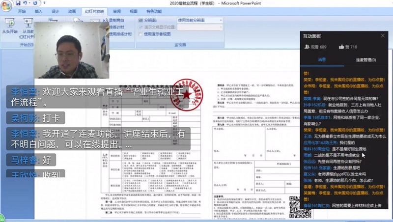 根据毕业生求职中的诉求,结合当前就业形势,从求职应聘技巧、就业安全与风险防范、就业创业流程等方向设计了求职礼仪、求职心理、求职风险、视频面试、创业教育、创业项目培育和就业流程等七个系列讲座内容,分别由我校长期从事就业创业一线工作的老师担任主讲。活动前期,辅导员利用QQ、微信、钉钉、学习通、腾讯课堂等线上工具,通过发布讲座海报、活动链接等方式,把讲座活动通知到2020届毕业班每一位同学,同时吸引了非毕业班同学的积极参与,提前了解就业创业相关知识。活动中,老师们用系统的理论、生动的案例、风趣的语言,把毕业生在求职创业过程中个人能力的展示方式、需要注意的要点以及可能面对的困难进行深刻剖析,学生围绕知识点通过线上弹幕与主讲教师进行现场交流互动,在一问一答中加深了学习印象,在共同努力中展现了讲座效果。